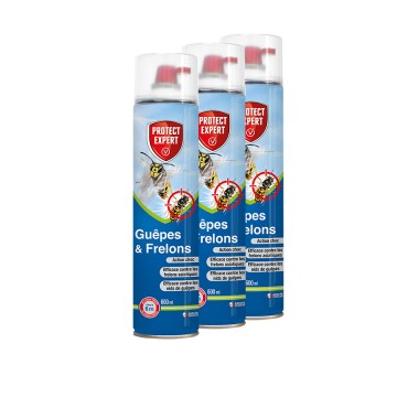 Le produit Protect Expert, sous forme d'aérosol à jet longue portée, offre une solution efficace pour lutter contre les guêpes, frelons et leurs nids dans les espaces extérieurs tels que les terrasses et les zones ouvertes.