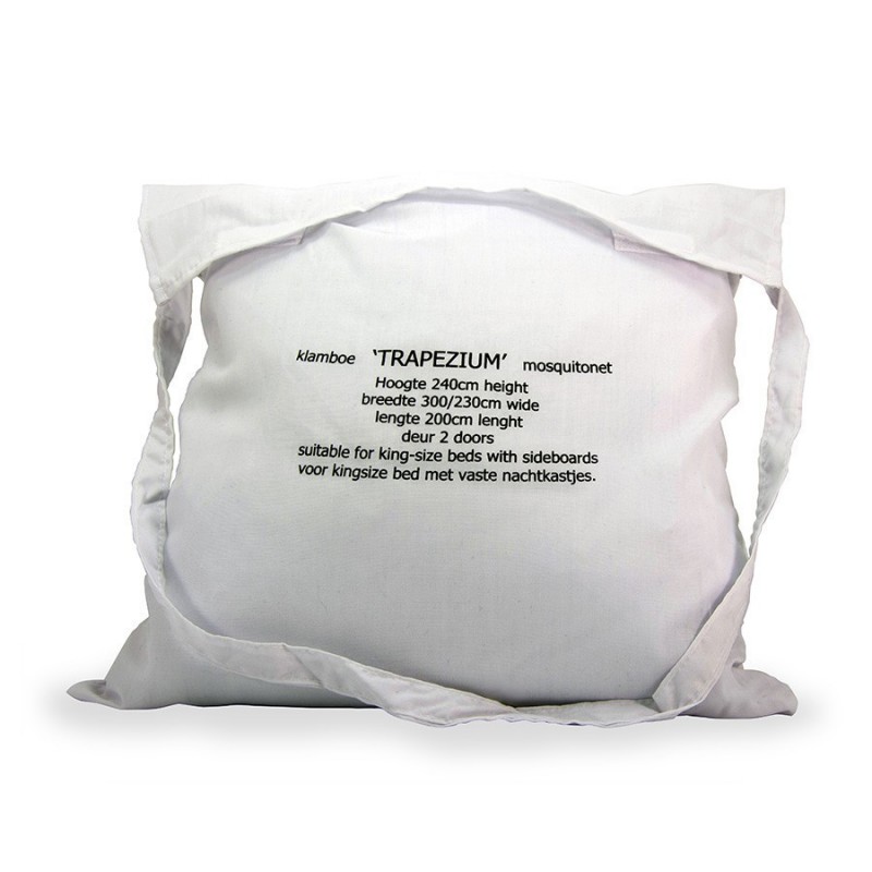 La moustiquaire Trapezium est spécialement prévue pour les lits doubles avec tables de chevet attachées au lit. Le filet mesure 300 cm de large à l’arrière et 240 cm à l’avant. La moustiquaire comprend également une entrée des deux côtés. Sa fixation s’effectue aux quatre coins du plafond ou directement au mur avec des cordons.